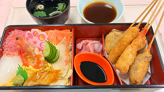 新鮮なサーモン・イカ・エビなどを乗せたちらし寿司と各種串カツの5本セットです。