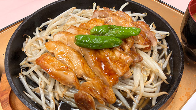 若鶏はジューシーに、甘辛醤油だれで仕上げました。もやしと一緒にアツアツの鉄板でどうぞ。